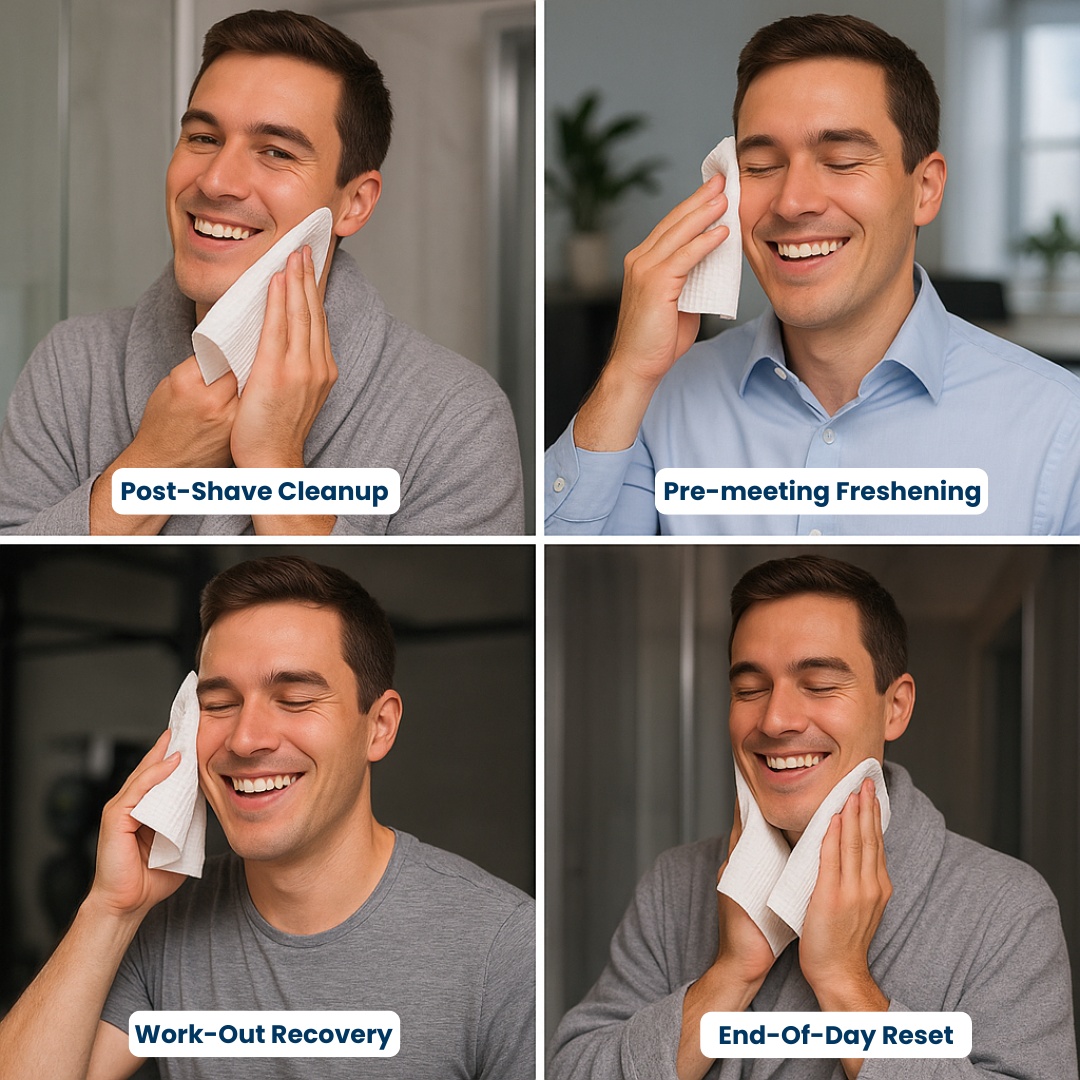 Clean Towels XL aren't just face towels – they're your complete facial care solution. Use them for post-shave cleanup, pre-meeting freshening, workout recovery, or end-of-day reset.